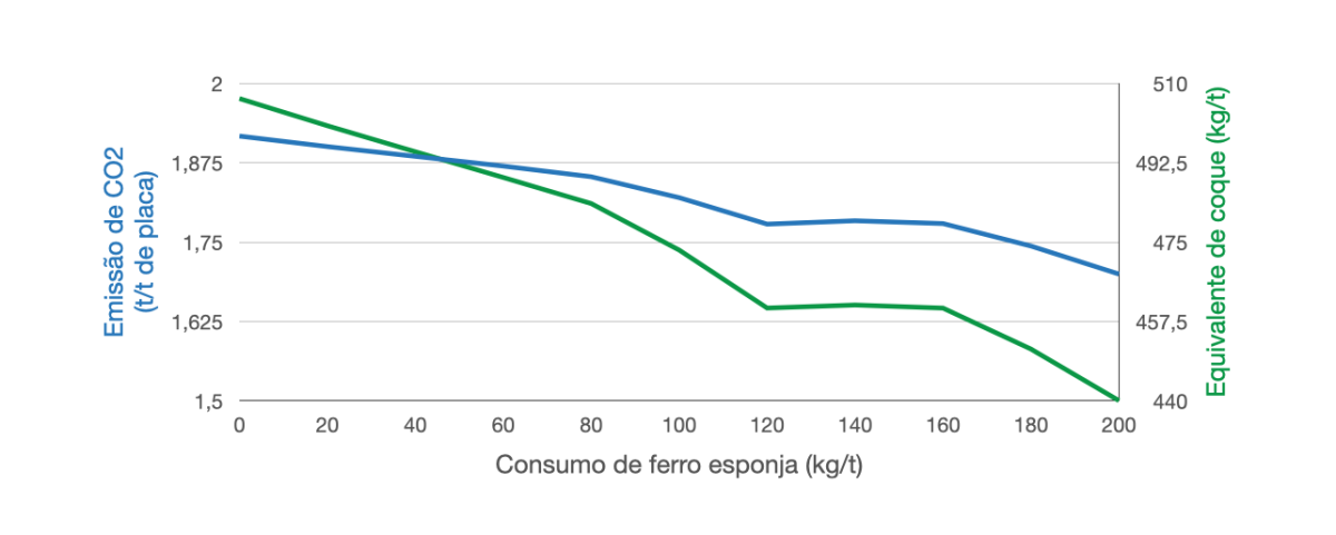 O consumo de 200 quilos de ferro esponja por tonelada de gusa reduziu a taxa de emissão de CO2 em 0,21 t CO2 / t placa (quase 11%). Vale ressaltar que esta alternativa possui restrições operacionais que naturalmente limitam o uso do ferro-esponja.